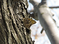 4月28日、気は重いが再び生息状況を確認しにいってみたが予想通り蝶の姿は見えず、隣接公園のセンダンにわずか2匹のサトキマダラヒカゲ(左写真)を見ただけであった。細々と生き残ったこの蝶も環境の激変に代をつなげるのは難しいだろう。